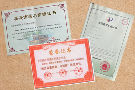 紅旗過濾全自動過濾機專利證書和多項榮譽證書